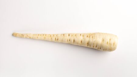 A single fresh parsnip, isolated on a white background, highlighting a root vegetable