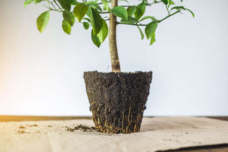 A young orange tree with roots in the ground in the form of a pot on the table. Preparing the plant for transplanting into the ground. Concept of gardening and care of domestic plants