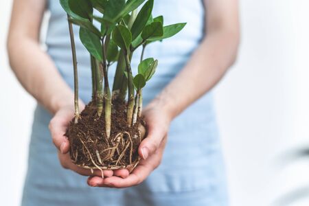 Close up view of young gardener woman holding green plant with root system in soil ground on light background with copy space