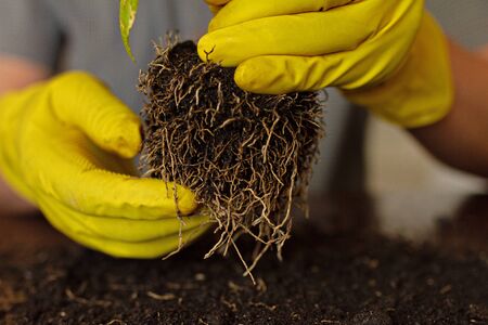cleansing the root system of the old ground for transplanting into a new flower pot