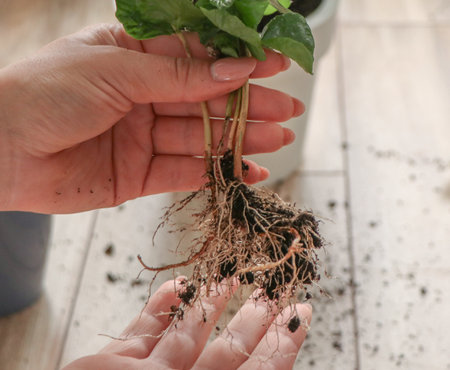 Roots of a large houseplant in a woman's gloved hands