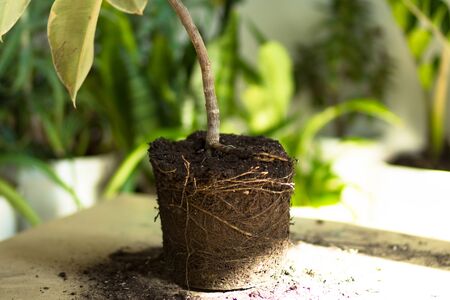 Root of ficus on the table before repotting