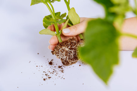 A woman holding a stalk of cucumber seedlings on a white background, shows the root system.