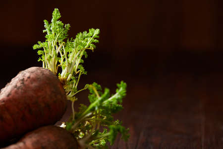 Bundle of carrots with soil over rustic wooden background, side view, close-up, selective focus, low key. Harvesting bunch. Fresh raw carotene. Unpeeled tasty roots. Healthy food background.