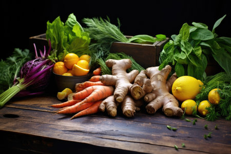 fresh ginger, turmeric, and other medicinal roots on a wooden table, created with generative ai