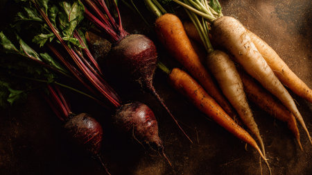 Fresh beets and carrots are arranged in an earthy layout, highlighting their vibrant colors and unique textures while maintaining a natural and serene ambiance.
