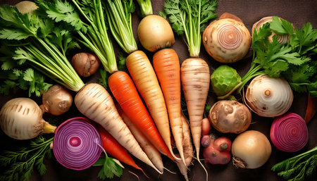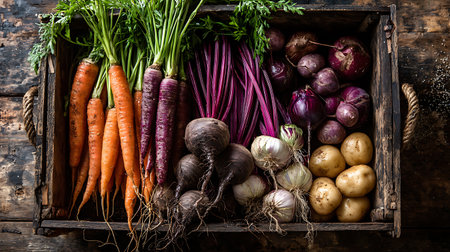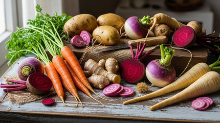 A stunning arrangement of freshly harvested root vegetables showcasing vibrant colors and earthy textures, perfect for culinary inspiration and healthy cooking ideas.