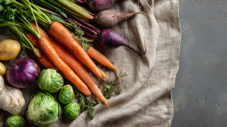 An assortment of fresh organic vegetables including carrots, potatoes, beets, and garlic arranged beautifully on natural linen fabric, perfect for healthy meal preparation.
