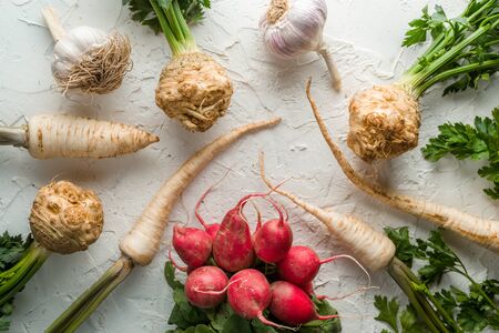 Background of celery roots, parsley, radishes with leaves and garlic on white table