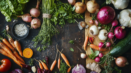 Capture the essence of farm-fresh root vegetables, including vibrant carrots, onions, and beets, arranged beautifully on a rustic wooden surface with soil accents.