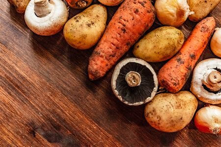 Flat lay of assortment of fresh root vegetables, bio healthy, organic food on wooden background, country market style, garden produce, diet veggie food, clean eating.