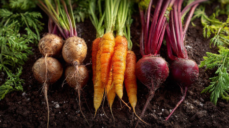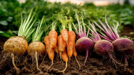A stunning display of freshly harvested root vegetables, showcasing a variety of colors and shapes against rich soil, highlighting the beauty of nature's bounty.