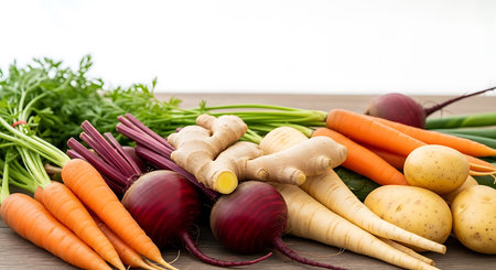 A vibrant collection of assorted root vegetables, beautifully arranged on a white background. Perfect for promoting healthy cooking and nutrition.