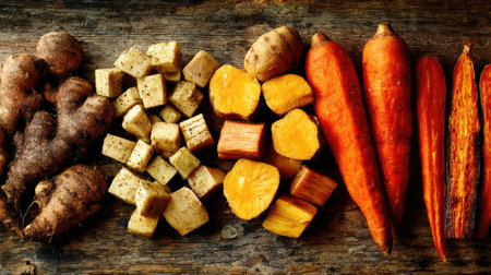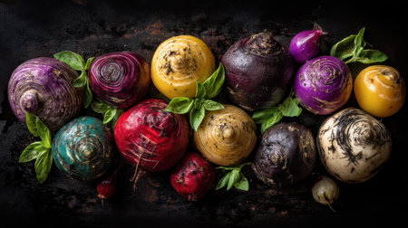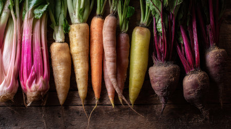 A vibrant arrangement of fresh root vegetables showcases a variety of colors and textures, ideal for culinary applications. Perfect for healthy cooking and presentations.