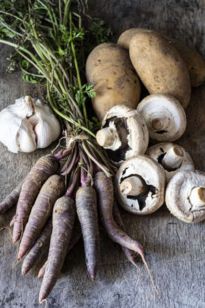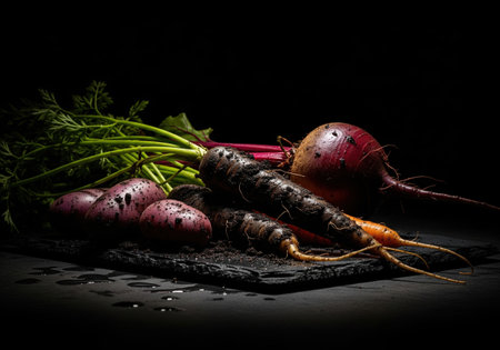 A dramatic still life of freshly harvested organic root vegetables. Colorful carrots, potatoes, and beetroot still covered in soil.