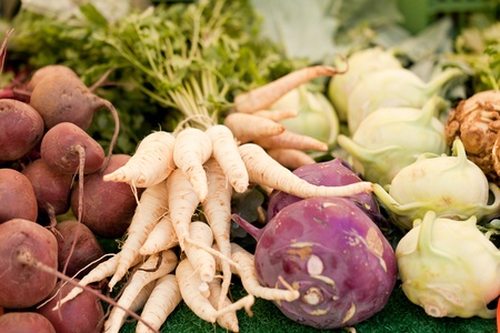 Freshly harvested colorful root vegetables, including turnips, parsnips, carrots, beets, and potatoes.