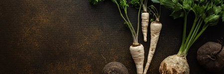 Parsley and selera roots with tops and black radish close-up on a brown background, top view, healthy autumn seasonal roots banner, copy space