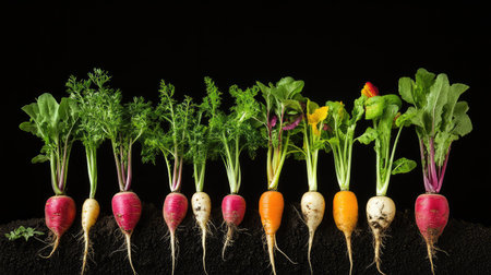 A visually stunning array of root vegetables including radishes and carrots showcasing their colorful tops against a dark background, perfect for promoting healthy eating and fresh produce concepts.