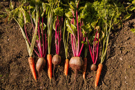 In the fall, there is a harvest of carrots and beets in the garden. Harvesting concept.