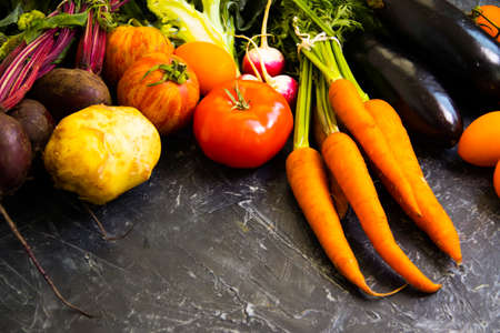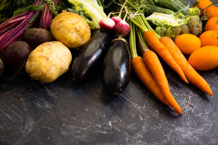 Fresh organic vegetables on a dark wooden background, top view, copy space