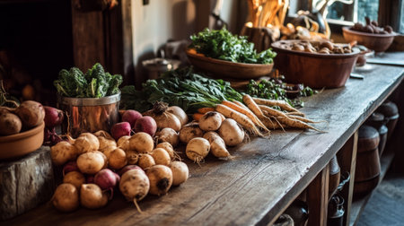 Rustic wooden kitchen countertop with a variety of root vegetables, earth tones, generative ai