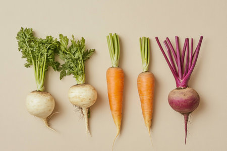 Fresh and colorful root vegetables arranged on a beige background, showcasing healthy eating with carrots, beets, and turnips
