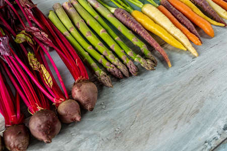 Various root vegetables on wooden background. Radishes, colorful carrots and asparagus.