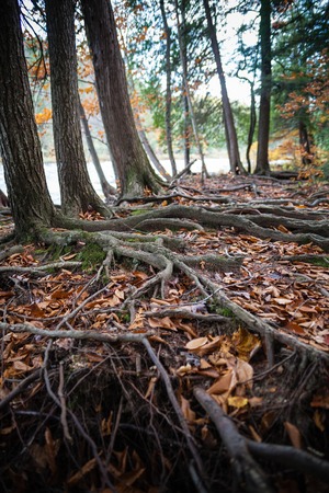 treeroots emerging from the ground in autumn