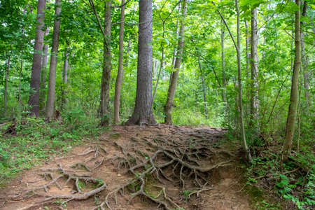 Tangled tree roots along enchanted forest path.