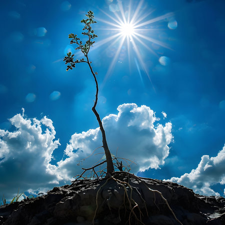 A lone tree stands tall against the backdrop of a brilliant blue sky, bathed in the warm glow of the sun. Its roots reach out to the ground, while the bright sun shines above, casting a beautiful silhouette