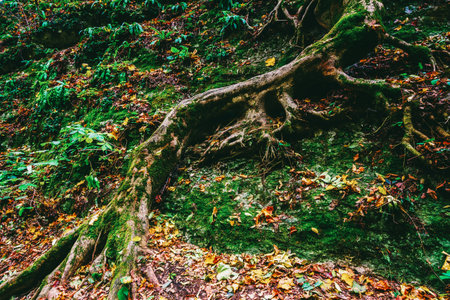 This close-up image showcases the intricate details of tree roots merging with rocky terrain, surrounded by lush greenery and moss. Ideal for nature themes.