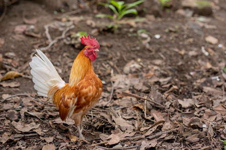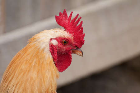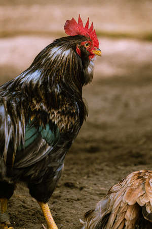 Beautiful rooster in the farm. Selective focus. Shallow depth of field.