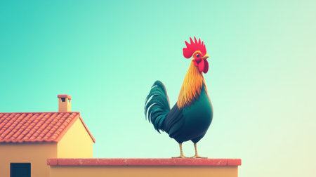 A cheerful rooster stands confidently on a rooftop against a soothing blue sky. This colorful illustration captures the essence of farm life with vibrant details.