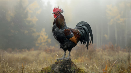A majestic black rooster stands proudly on a wooden post in a misty field, evoking a sense of tranquility and rural charm.