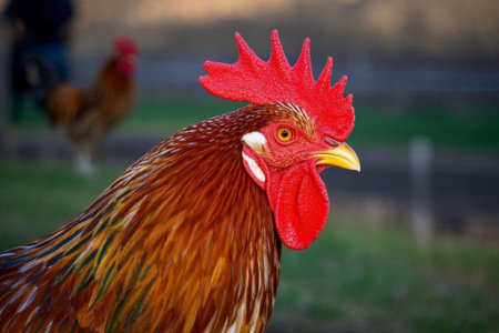 A vibrant rooster stands with confidence, showing its detailed plumage against a soft, bokeh background in a pastoral scene.