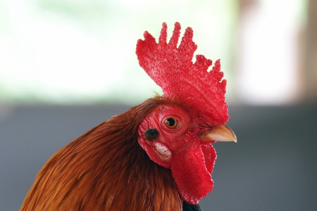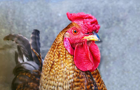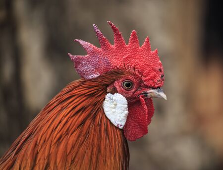Portrait of a red rooster with a red scallop in the sunlight. Selective focus