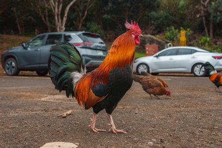 Rooster and Hens in a Parking Area with Tropical Greenery