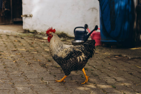 A hen roosting in a farmer's yard in summer. Black and white plumage, bright red scallop and beak. High quality photo
