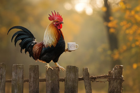 A vibrant rooster stands proudly on a wooden fence, overlooking a misty rural landscape with trees turning autumn colors.
