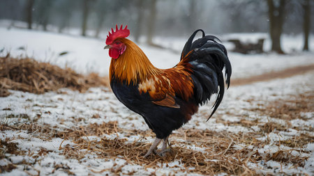 A colorful rooster is presented in profile, showcasing a spectrum of rich colors and textures. Its plumage displays shades of red, orange, black, and blue. The composition is set outdoors, with a blurred background hinting at a rural or agricultural environment. Suitable for a variety of commercial and editorial applications.