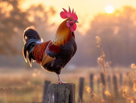 Idyllic Countryside, Majestic Rooster at Sunrise