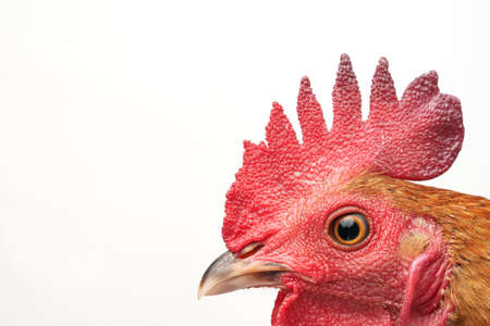 Close up of a white rooster with vibrant red comb and wattles against a soft gray background