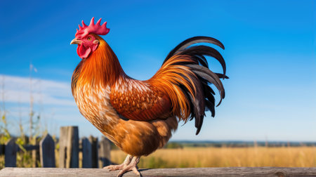 A close-up of a proud feathered rooster perched on a weather-beaten wooden fence, its bright plumage shining brightly against a clear blue sky