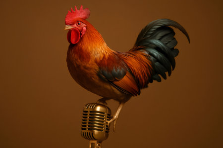 Surreal image of a rooster singing on a vintage microphone, representing concepts like freedom of speech, expressing yourself and new points of view