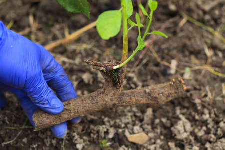 Roots extend through dark soil with small stones and organic matter visible around. Natural light illuminates the scene, highlighting the growth beneath the surface.