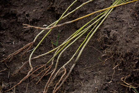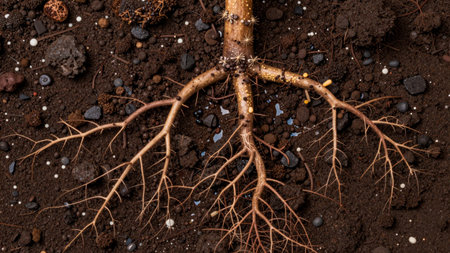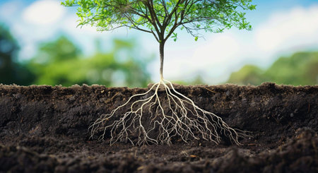 Close-up of plant roots thriving in nutrient-rich, fertile soil. Witness the beauty and vitality of nature's underground marvels