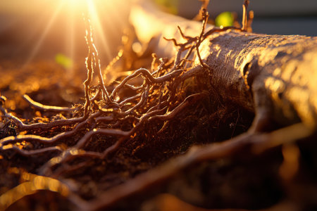 Close up view of plant roots reveals their fibrous structure and complex networks illuminated by gentle sunlight. The earthy tones create a rich visual of natural growth in soil.