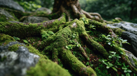 A captivating close-up of tree roots intertwined with vibrant green moss, showcasing the intricate details of natural growth in a serene forest setting.