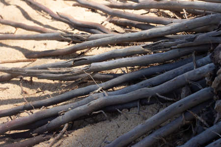 Minimalist composition of tangled dried vetiver roots on white background, capturing their natural patterns and rugged textures