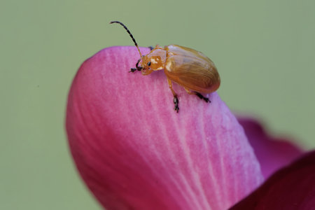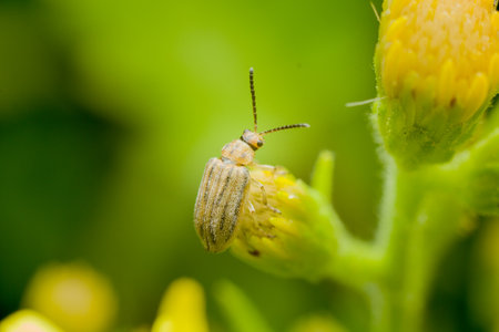 Cereal leaf beetle (Oulema melanopus) eating yellow elder flower, close up photography.